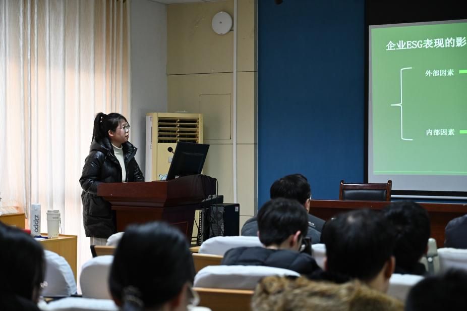 第二位分享者自2023级管理科学与工程专业的李娇。她主要聚焦于“共同股权网络下企业ESG表现的同群效应”展开汇报,引入“共同股权网络”这一全新研究视角,提出核心假设:共同股权网络下企业ESG表现存在同群效应,并从“信息传递、退出威胁、资源获取”三个机制展开分析。汇报中,她详细介绍了样本选择、变量定义与模型设定,并通过工具变量法、安慰剂检验等一系列方法,验证了结论的稳健性。最终,她总结出三点核心发现:共同股权网络下企业ESG存在显著同群效应;信息、威胁、资源机制是主要驱动因素;行业共同股权网络越密集,效应越显著,并从企业、股东、政府层面给出了针对性建议。结束时,她还分享了学术写作心得:“问题导向与证据表达是论文核心,要多问多看、讲好研究故事”。