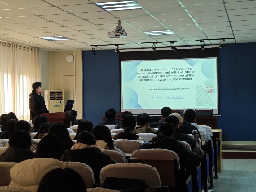 第一位分享者是2023级管理科学与工程专业的郭益豪,以《Beyond the screen: Understanding consumer engagement with live-stream shopping from the perspective of the information system success model》研究为引,深入剖析直播电商行业现状——从全民热捧的发展机遇,到“虚假宣传”“数据造假”等现实挑战,精准点出当前研究中“单一路径解释为主、缺乏系统整合”的痛点。他结合信息系统成功模型(ISSM),提出“将情感、信任拆分为主播/产品双路径,考察其对观看与购买行为的差异影响”的研究思路,还创新性地引入“品牌知名度”作为调节变量,为直播电商的学术研究提供了新的视角。他还进一步给出管理启示:强品牌可弱化价格诉求、突出信任与场景体验,弱品牌则需强化性价比;新老客群应分别侧重价值线索与关系经营。在最后,他提出未来研究方向——可开展跨品类/跨文化对比、引入行为日志与实验法增强因果性,或探讨算法推荐公平性对信任的影响。