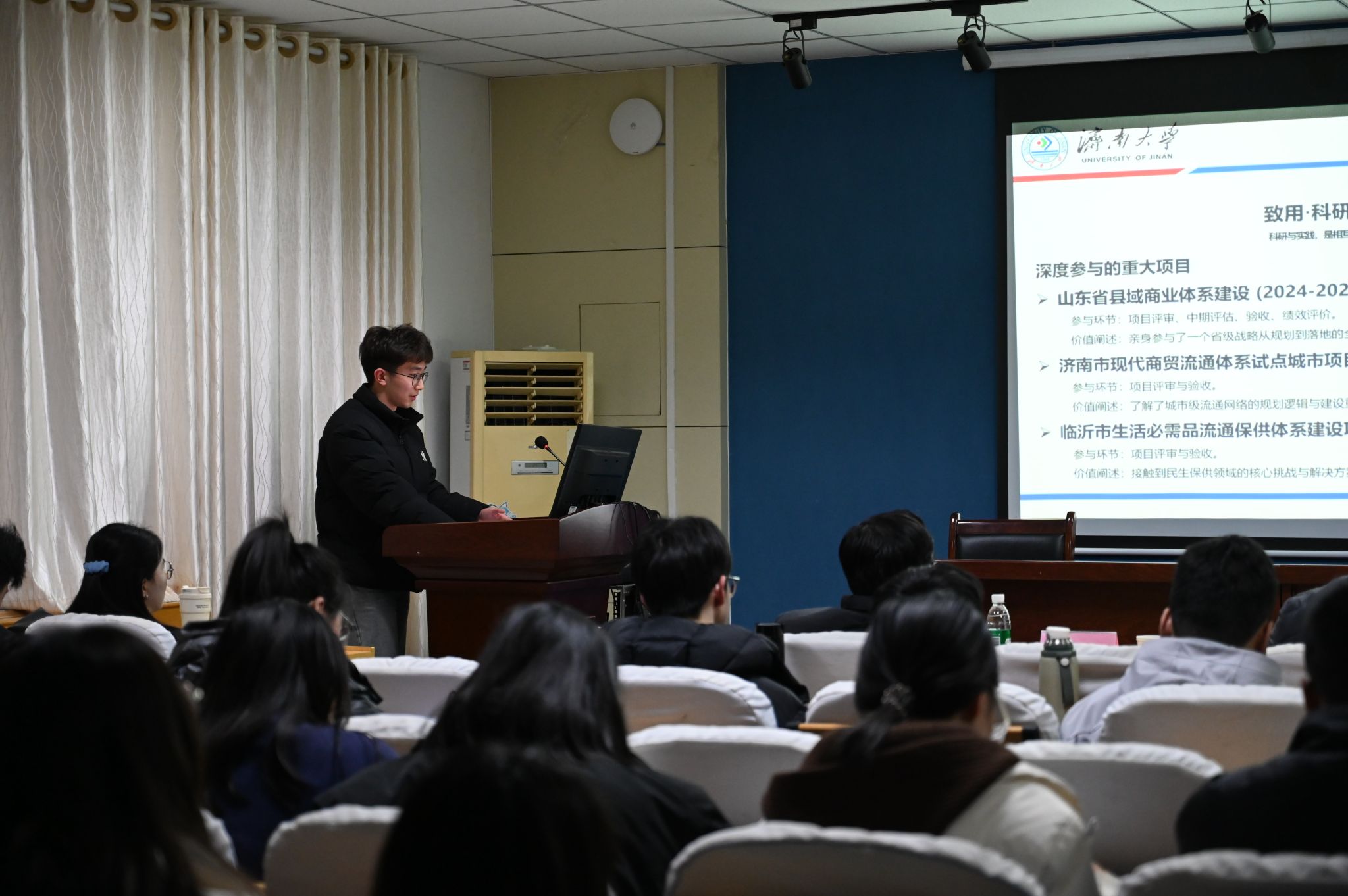 第三位分享者是2023级物流工程与管理专业的宋士元,他以“课堂-科研-实践”为主线展开分享,其汇报框架分为三部分:固本:课堂学习是基石。他强调专业课是知识体系的骨架,建议同学们从“学知识”转变为“找方法、寻灵感”——带着“理论能解决什么行业问题”的思考听课,主动与老师交流,同时认真对待课程报告与论文,将其作为学术写作的初练笔。深研:从课程到论文与竞赛。他结合自身经历,分享了如何将课堂所学延伸至科研与竞赛:把课程中的理论模型转化为论文选题,通过竞赛锻炼系统思维,让课程、论文、竞赛形成能力互补的链条。致用:科研与实践的闭环。他以自己参与的重大项目为例,说明“科研驱动实践、实践反哺科研”的价值,能帮助快速理解实践项目;而实践中获取的鲜活素材,又能让论文选题更贴近行业真实需求,避免“纸上谈兵”。最后,他以“在课堂上积蓄力量,在科研中寻求突破,在实践中验证价值”作结,为同学们的学术成长提供了清晰的方向参考。