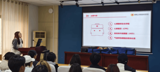 培训中,协会成员基于扎实的应急管理专业基础,将专业救护课程内容与真实场景有机结合,系统讲解了心搏骤停的识别要点与“生存链”运行机制,并重点演示了心肺复苏的标准化操作流程。在讲解自动体外除颤器时,主讲人不仅说明了设备的使用步骤,更从应急管理专业角度分析了在公共场所配置AED的规划逻辑与响应策略,帮助大一同学在掌握技能的同时,理解其背后的应急管理体系设计。