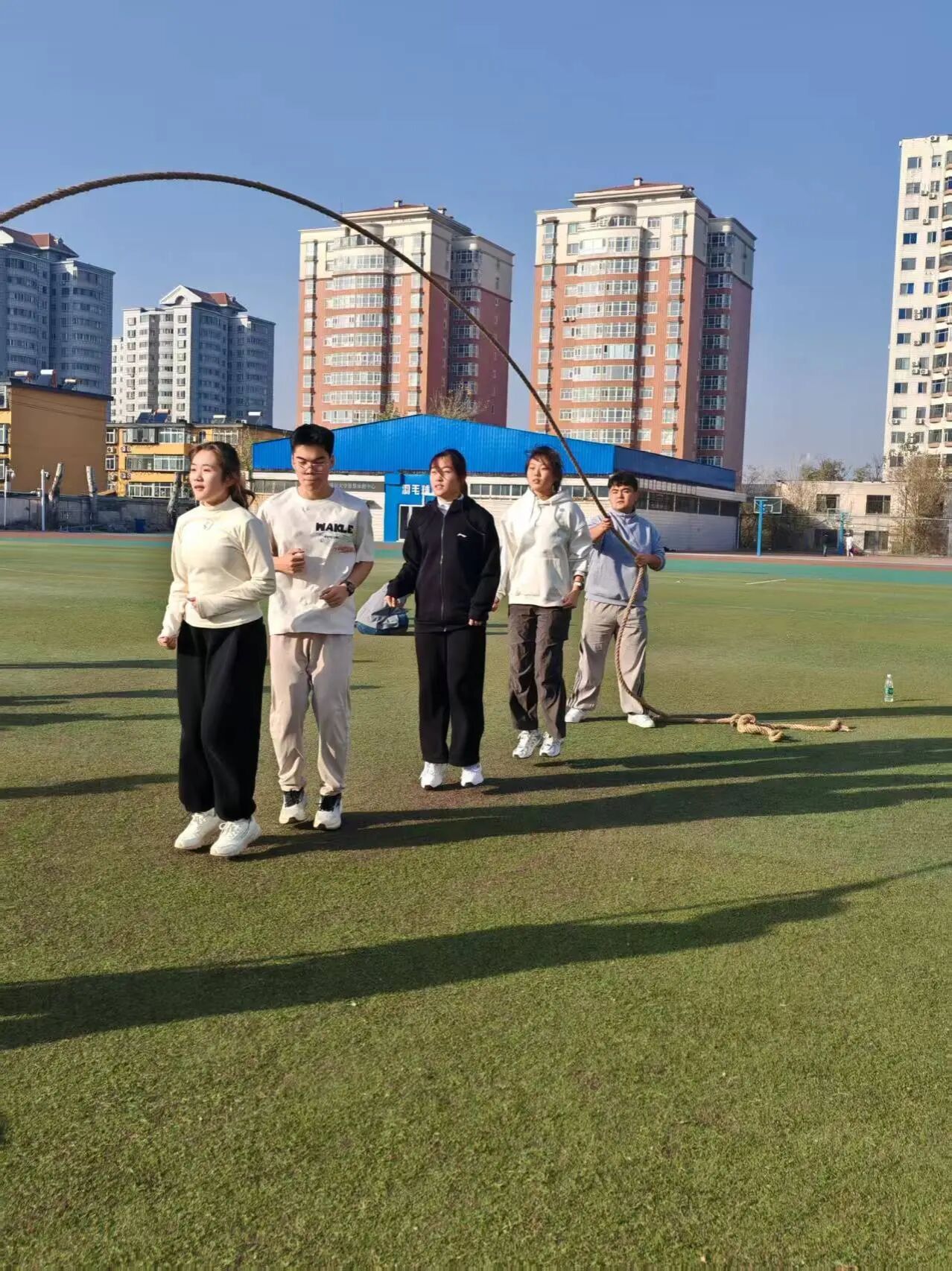 6名队员组成的队伍需在2分钟内完成计时跳跃。长绳翻飞间,队员们找准节奏、鱼贯而入,身轻如燕的跳跃与整齐划一的步伐相映成趣。有人偶尔绊绳,但也能迅速调整状态重新加入,这场“速度与默契”的比拼,不仅锤炼了团队协作能力,也让欢乐氛围持续升温。