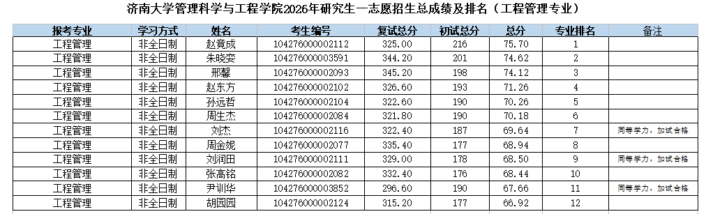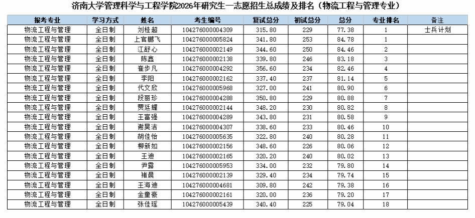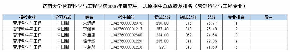 根据《济南大学2026年硕士研究生复试录取工作方案》《管理科学与工程学院2026年硕士研究生复试录取方案》的相关要求和部署,管理科学与工程学院2026年硕士研究生招生一志愿批次复试工作已圆满结束。现将一志愿考生成绩予以公示。