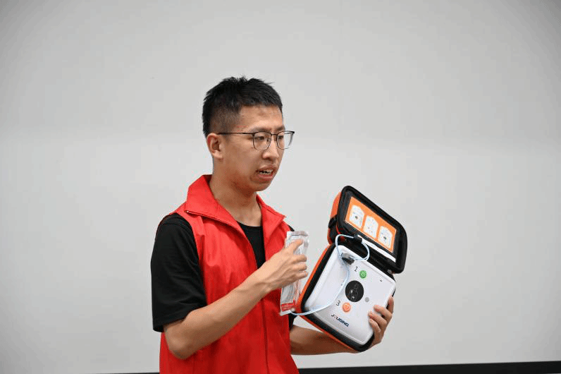 那个经常在公共场所见到、像小箱子一样的自动体外除颤器(AED),是做什么用的?队员们用通俗语言解释道,“它就像一个聪明的‘心脏重启器’,在关键时刻能帮助心脏重新跳动起来!”通过简单的动画演示和互动问答,队员们展示了AED的“傻瓜式”操作——开机、听指令、贴片、放电,让孩子们明白了这个“救命神器”其实操作很简单,消除了陌生感。