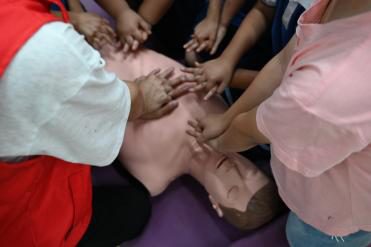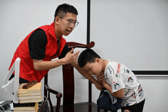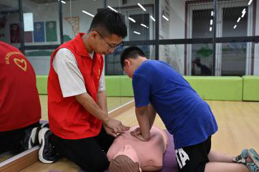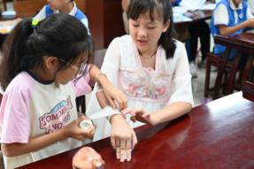 面对一群充满好奇心的“小听众”,实践团成员化繁为简,生动比喻讲解心肺复苏术(CPR),队员们用朗朗上口的顺口溜(如“叫叫CAB”),让孩子们轻松记住关键步骤:“叫”病人、“叫”帮忙、“C”按压、“A”气道、“B”呼吸。看到模拟人“安妮”时,孩子们兴奋不已,在成员手把手指导下,一双双小手认真地按在模拟人胸口,体验了一次“小小急救员”的感觉。现场还巧妙融入“以问促学”“以奖促学”的互动模式,孩子们踊跃抢答,在轻松氛围中掌握了关键理论。